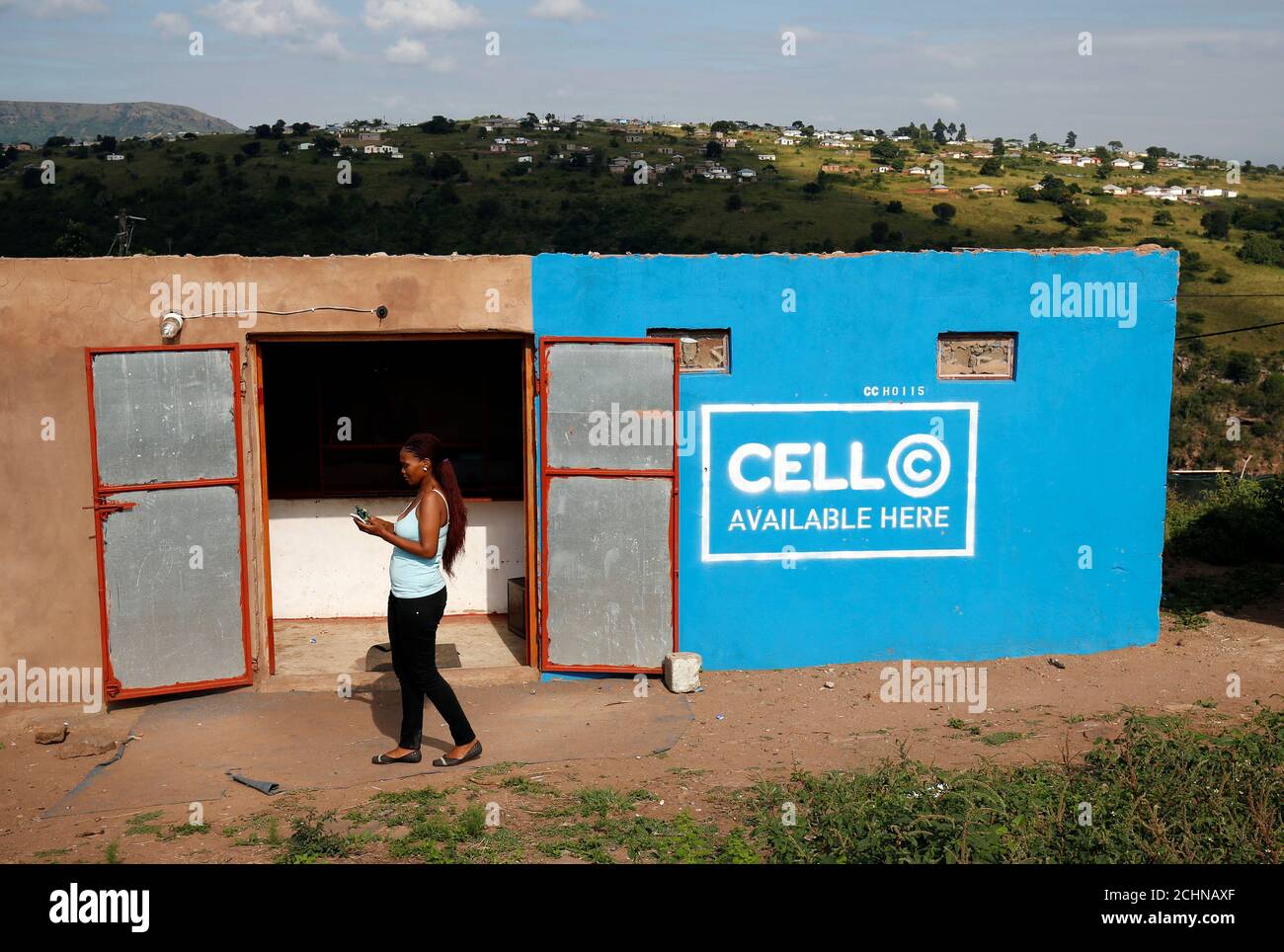 A Woman Uses Her Mobile Phone In Front Of A Store With Telecom Company Cell C Branding In Kwandengezi South Africa March 28 2017 Reuters Rogan Ward Stock Photo Alamy